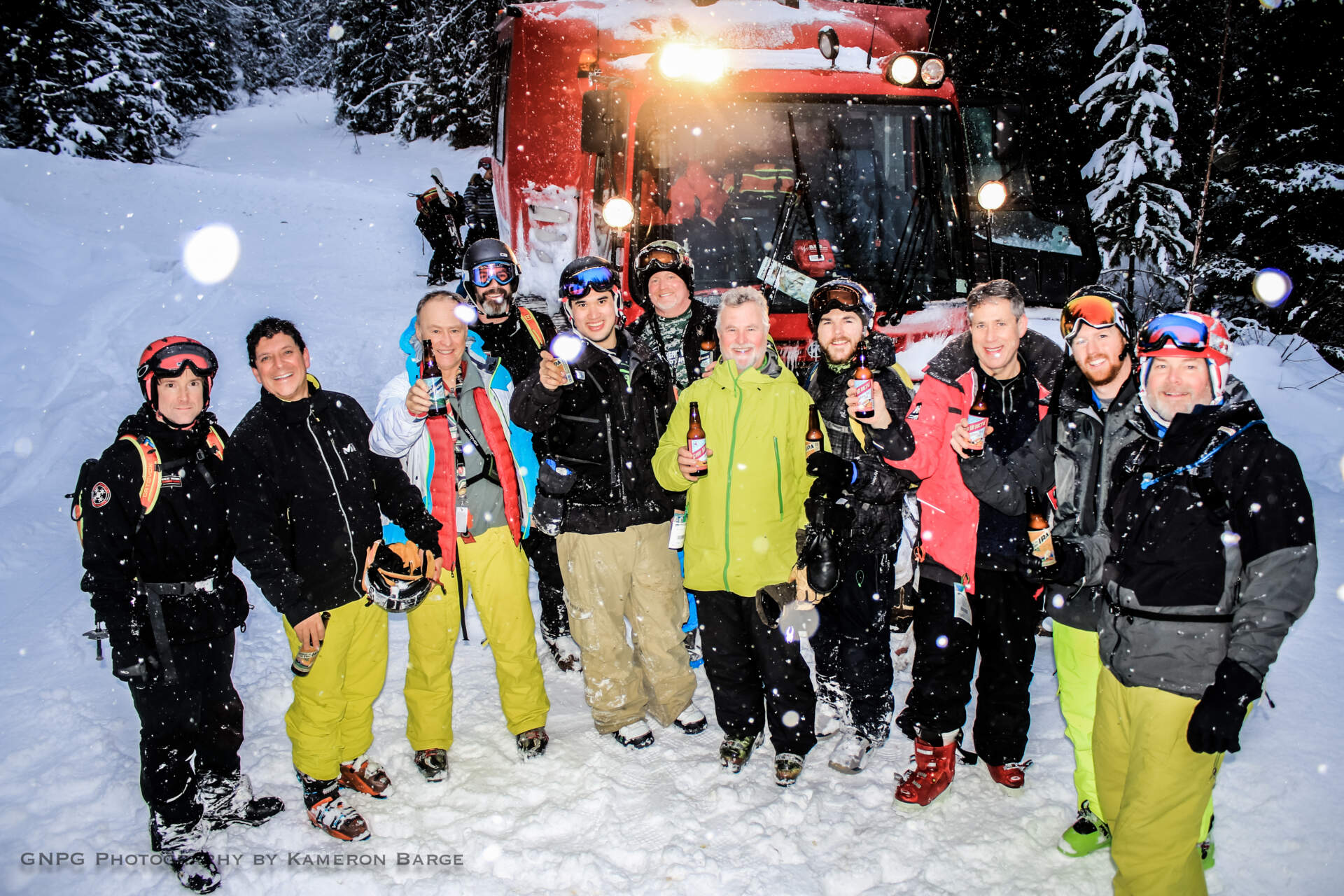Cat skiing guests relaxing in GNPG after trip Backcountry skier descending through glades during a GNPG trip